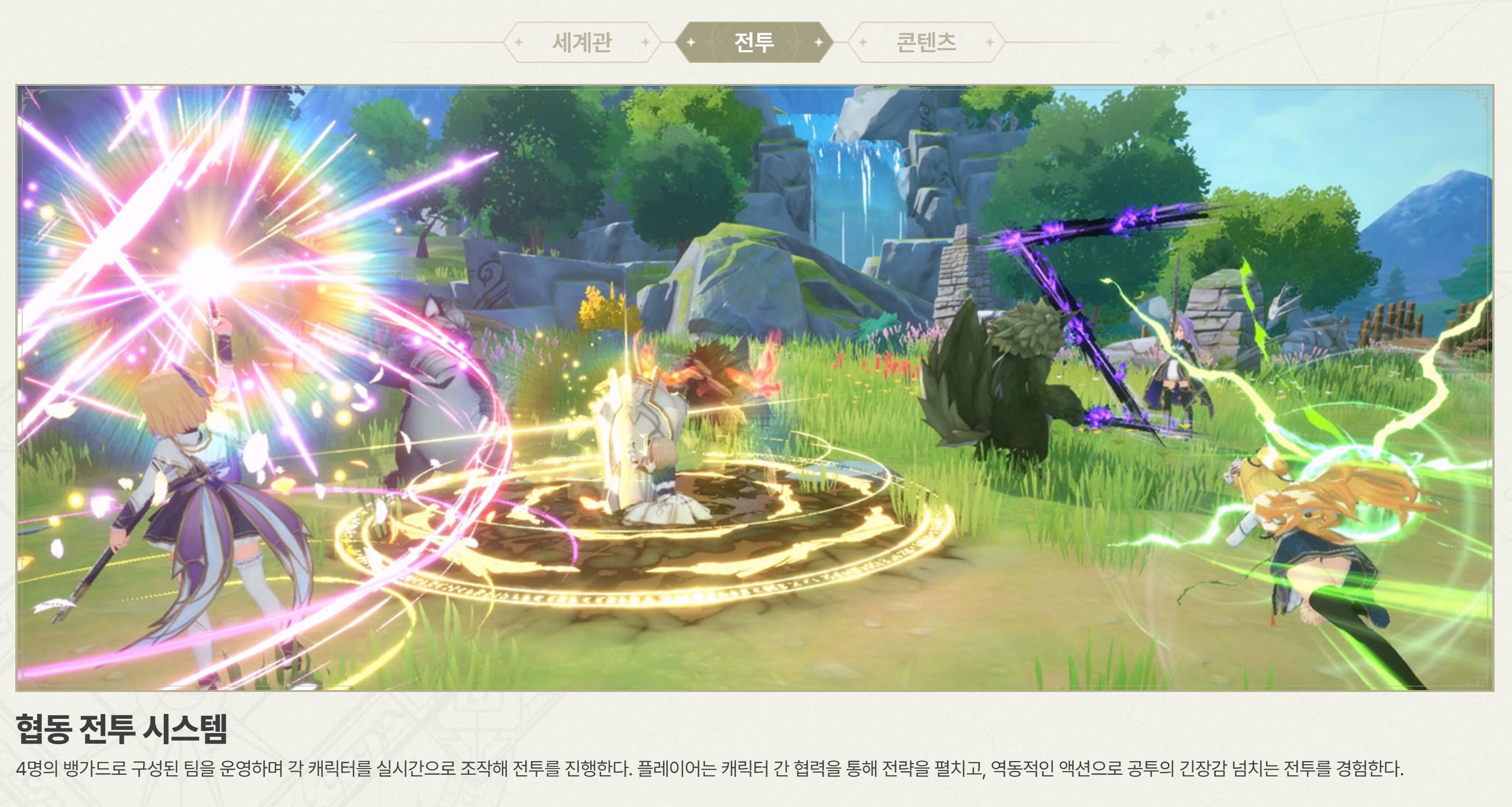 전투시스템은 실시간 4인 파티 액션 RPG 방식이에요.