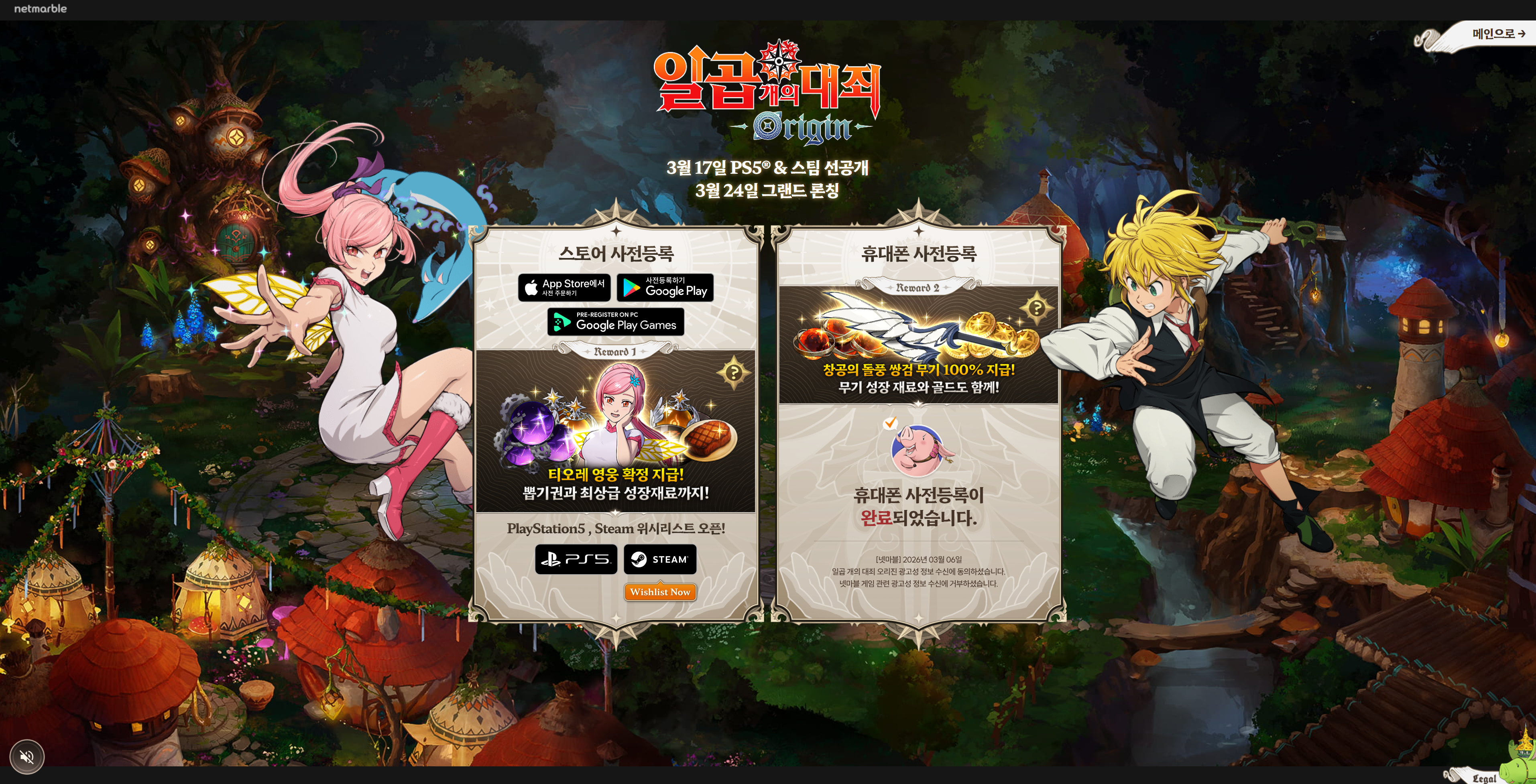 공식 사이트(7origin.netmarble.com), 구글플레이, 앱스토어에서 진행 중입니다. 두 경로를 모두 등록하면 보상이 합산됩니다.